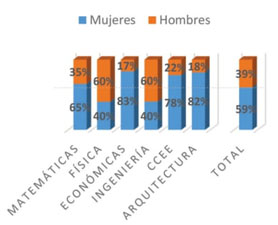 Como se aprecia en la figura 1, entre el profesorado de matemáticas en activo hay dos categorías que destacan, siendo los estudios de ingeniería los más representados (31.89%), seguido por los de matemáticas (30.27%). La tercera categoría que más figura la componen los que han estudiado un grado de Ciencias Experimentales [CCEE] (biología, geología, química, farmacia o biotecnología). En cuanto a la distribución de las titulaciones según el sexo, observamos en la figura 2 que, entre el profesorado que ha estudiado Ingenie-ría o Física, hay una mayor proporción de hombres que de mujeres (60% frente a 40%), mientras que entre los que han estudiado un grado de CCEE, Arquitectura y Económicas hay una clara mayor proporción de mujeres (cerca del 80% frente a 20% de hombres). En cuanto a Matemáticas, observamos que hay más mujeres (65% frente a 35% de hombres), pero que resulta una distribución similar a la distribución total de la muestra. Debido al bajo porcentaje de personas con estudios en magisterio (2 personas; 1.08%) el tamaño muestral no es representativo.