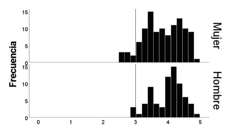 Figura 3 Distribución de la puntuación media de la ASPT según el sexo. La línea vertical indica la posición neutra, correspondiente al valor 3 de la escala.