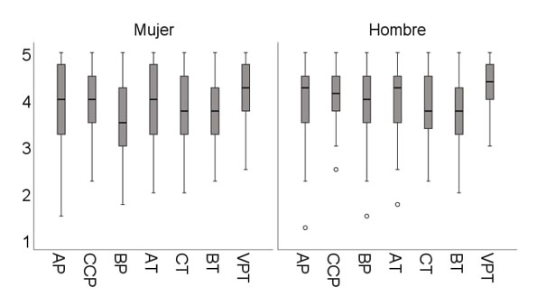 Por otro lado, en la tabla 6 podemos apreciar que la puntuación media de los hombres para la escala ASPT y cada componente es siempre mayor que la de las mujeres, dando a entender que la percepción del género masculino hacia los conocimientos de la probabilidad y su enseñanza es superior. Esta interpretación queda ratificada por los valores de la mediana (figura 4), que muestra mayores valores para los hombres que para las mujeres para todos los componentes, excepto para el Componente de Competencia Didáctica (CT) y el Componente Comportamental (BT), en los que coinciden. Podemos ver, también, que el Componente de Valor hacia la Probabilidad y su Enseñanza (VPT) destaca positivamente en ambos sexos, seguido por el Componente Afectivo hacia la Enseñanza de la Probabilidad (AT) entre los hombres, y el Componente de Competencia Cognitiva apreciada hacia la Probabilidad (CCP) entre las mujeres. El componente peor valorado entre los hombres es el Componente Comportamental hacia la Enseñanza de la Probabilidad (BT), y entre las mujeres el Componente Comportamental hacia la Probabilidad (BP).