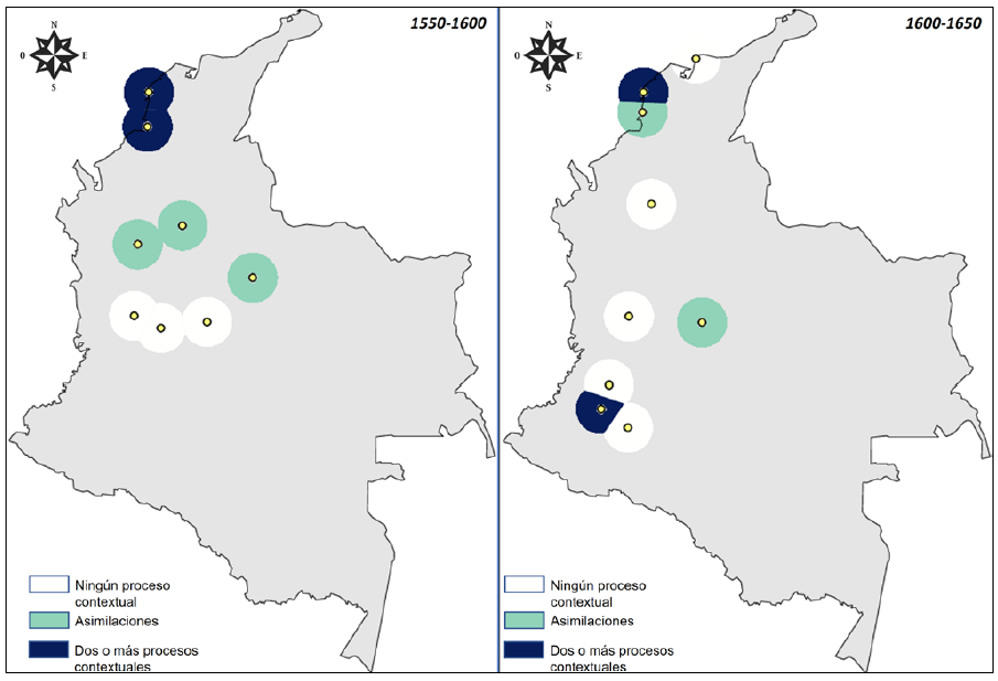 En la segunda mitad del siglo XVII, las asimilaciones se encuentran únicamente en territorios del interior neogranadino, como Toro (Valle del Cauca) y Zaragoza (Antioquia), que son zonas de tránsito entre Popayán y Cartagena de Indias con el centro administrativo de Santa Fe, que se había definido como locación de relevancia política en este periodo (Mayorga, 2013). La Tabla 8 ofrece el reporte de este periodo.
