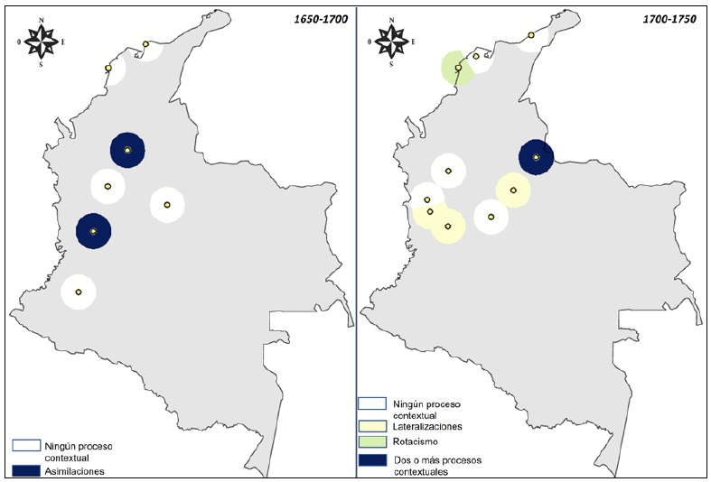 El Mapa 1 expone proyecciones cartográficas de los dos primeros intervalos temporales en comparación. Se reconoce un desplazamiento de los reportes de más de un proceso fonológico de territorios del ámbito del Caribe a los centros administrativos que se han estado consolidando, como Popayán, así como la extensión de reportes de asimilación del interior a las zonas costeras.