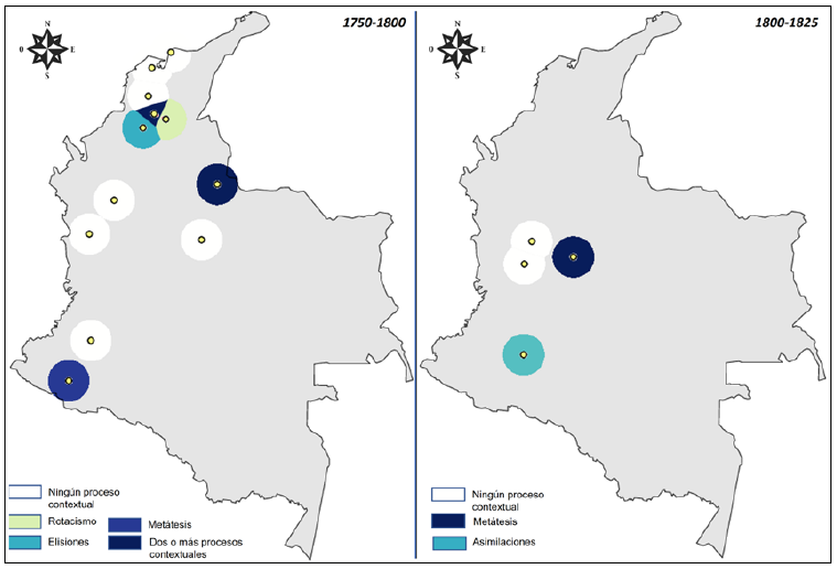 El Mapa 3 expone una diferencia espacial en la distribución de los procesos fonológicos contextuales en cuanto a que los territorios sureños neogranadinos comenzaron a ofrecer testimonios de divergencias en la pronunciación de los sonidos líquidos entre 1750 y 1825, con la reaparición de asimilaciones en estas zonas y un desplazamiento de la metátesis en dirección de sur a norte. El Caribe ofrece un sostenimiento de los rotacismos por segundo intervalo temporal consecutivo, reiteración que también tiene Silos, Norte de Santander, en cuanto ofrece la convergencia de dos sustituciones sonoras, ofreciendo estas constantes como comunes a lo largo del siglo XVIII.