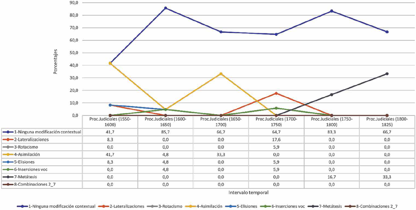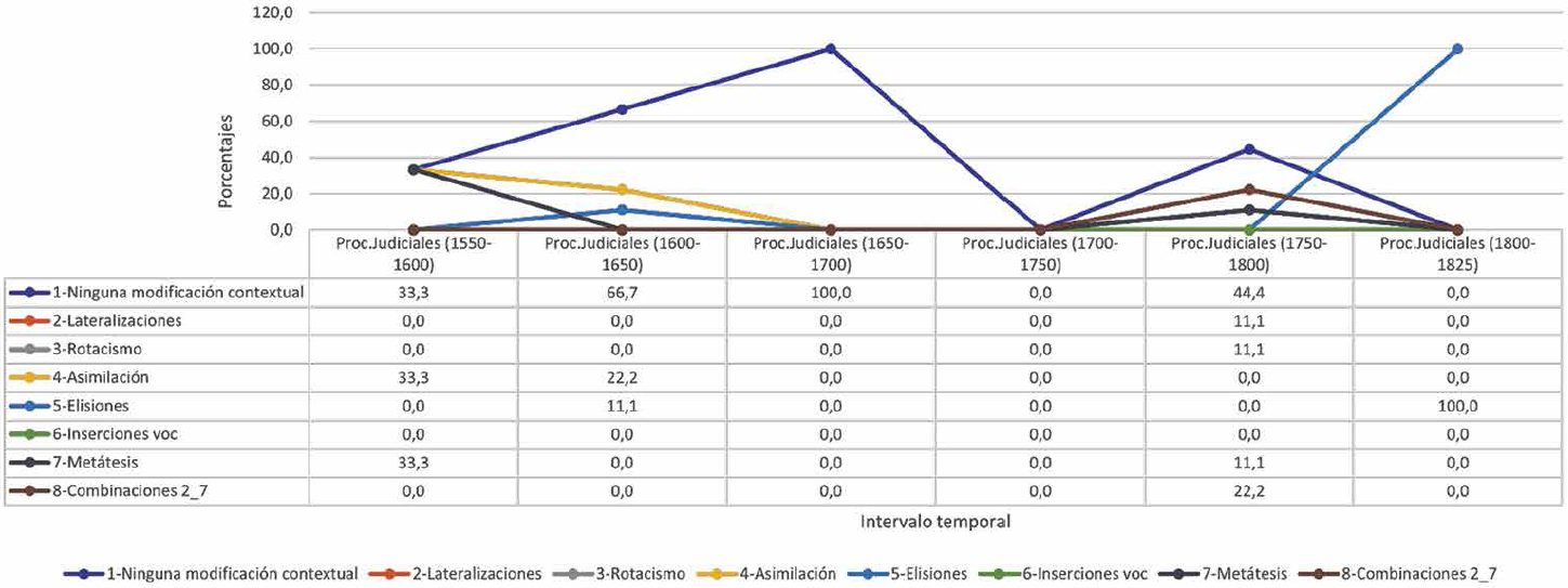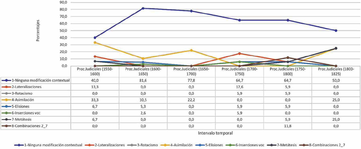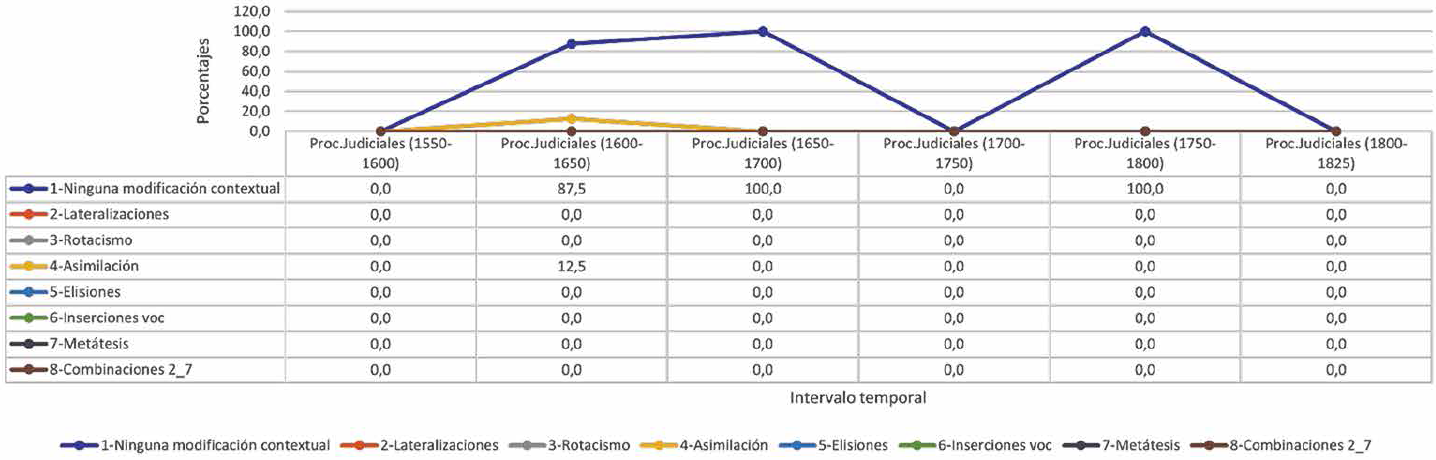 La Figura 1 representa la evolución global porcentual de la presencia de procesos fonológicos contextuales que afectan a consonantes líquidas según lo encontrado en documentos judiciales. De acuerdo con lo observado, en la segunda mitad del siglo XVI y en la primera parte del siglo XIX se encuentran las mayores presencias de textos con muestras de sustituciones sonoras activas, en tanto que los menores registros de estas son del siglo XVII. No hay proceso fonológico presente en todos los intervalos, pero los más recurrentes son la asimilación y la elisión, reconocidos en cuatro de los seis intervalos temporales revisados, siendo la primera un caso que redujo sus muestras en el siglo XVIII y la segunda, una sustitución poco recurrente, pero que no sufrió mayores diferencias porcentuales en el tiempo.