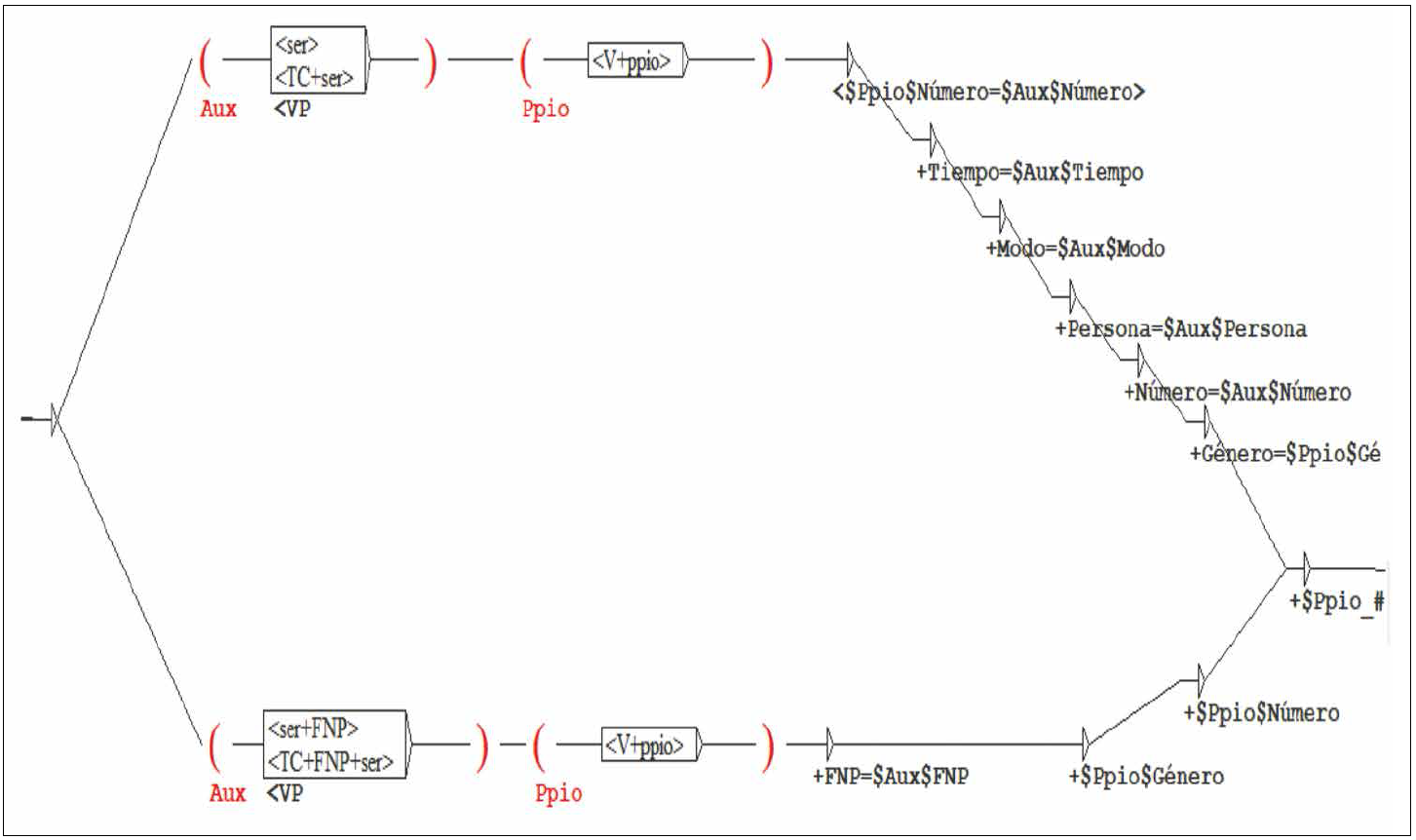 La captura que sigue muestra la gramática de grafos realizada para la detección automática de oraciones en voz pasiva construidas mediante el auxiliar ser conjugado más el participio correspondiente que concuerda en género y número con el núcleo del sujeto, es decir, las llamadas pasivas perifrásticas.