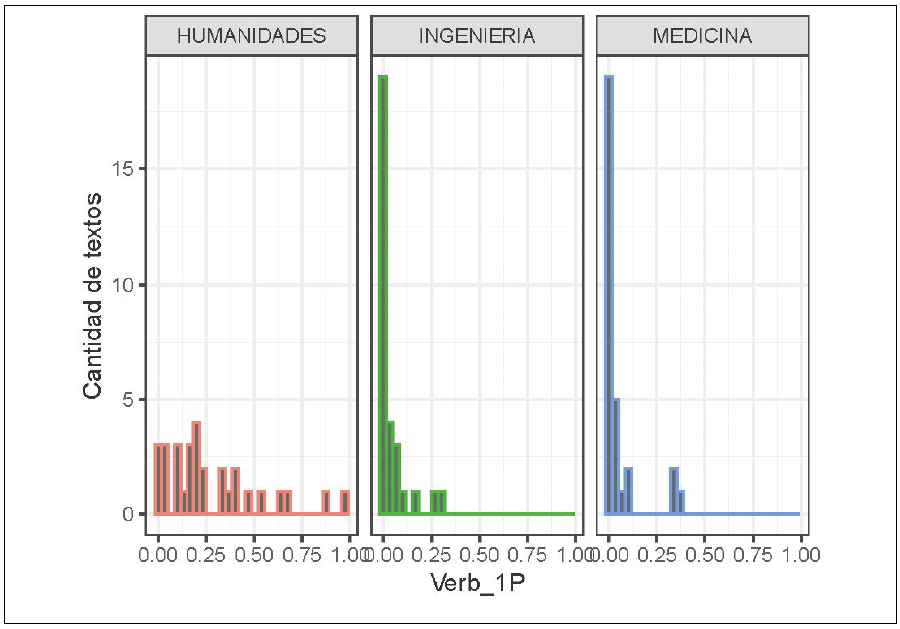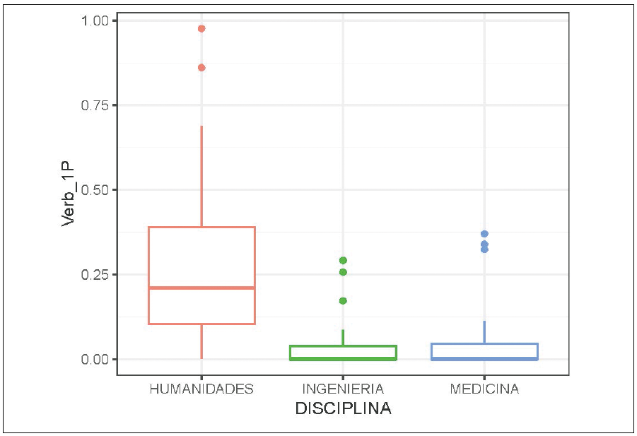 El 50% de los textos de humanidades presenta 0.21 ocurrencias de este tipo por cada 100 palabras mientras que en los otros dos subcorpus, por lo menos el 50% de los textos no presenta dicha estructura. Por lo tanto, los artículos de investigación con mayor heterogeneidad para la ocurrencia de verbos en primera persona plural son los que pertenecen a ingeniería, y medicina, biología y ciencias de la salud. Entre las otras dos áreas disciplinares la que menor cantidad exhibe es la de ingeniería (ver gráficos 7 y 8 en Anexos).