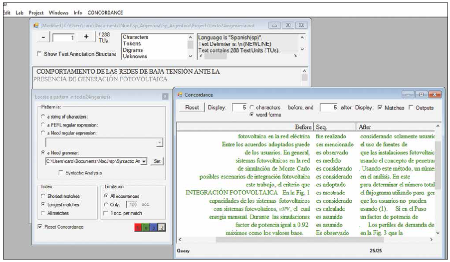 Como ya se mencionó, para la detección automática se utilizó el sistema NooJ (Silberztein, 2016), este software de acceso libre está disponible para el análisis morfológico, sintáctico y semántico de más de veinte lenguas naturales. Asimismo, ofrece para el análisis textual un procesamiento básico de tokenización y segmentación y listas de concordancia léxica basada en corpus y en frecuencias de palabras. Para llevar a cabo el reconocimiento automático se empleó el módulo sp (spanish) Argentina (Tramallino, 2013; Rodrigo y Bonino, 2019).