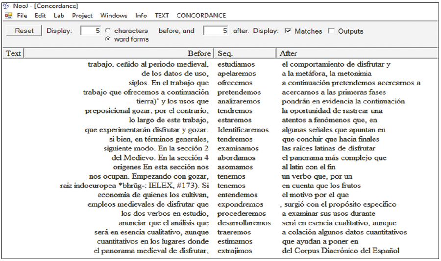 En tanto, este mismo procedimiento se utiliza para localizar los verbos en primera persona plural. Entre signos angulares se indica que busque con la etiqueta V (verbo) y se especifican los rasgos 1a (primera persona) y pl (plural). Como resultados obtenemos las siguientes concordancias que corresponden al texto núm. 3 del corpus correspondiente a humanidades: