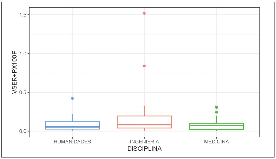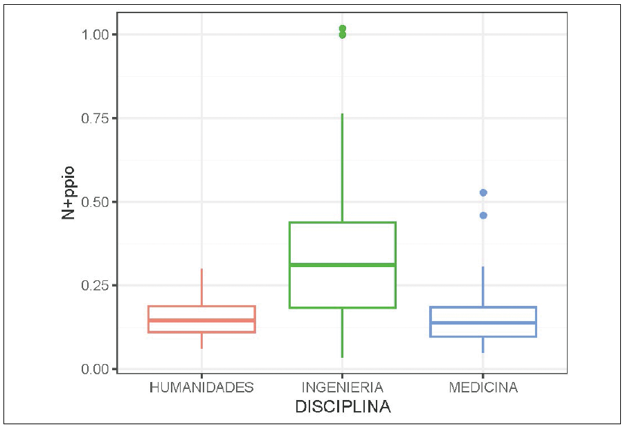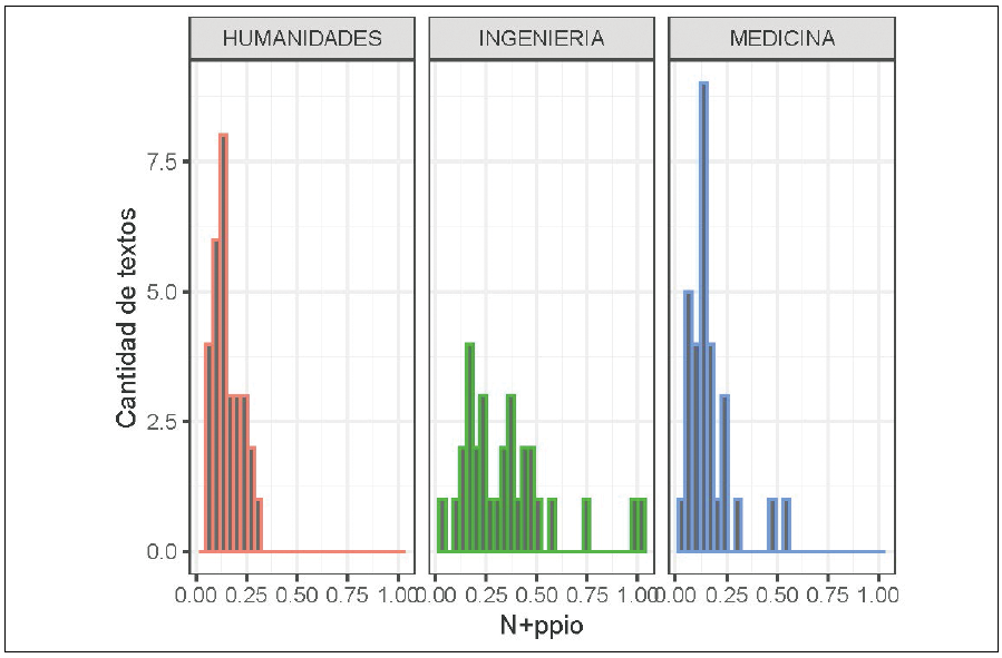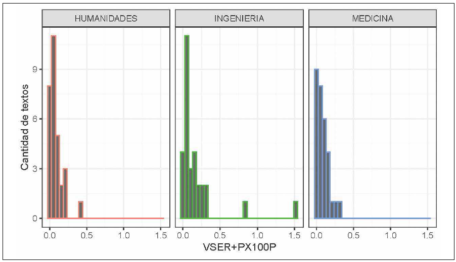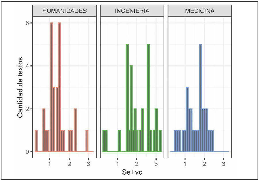 Por lo tanto, en la comparación de pares se ha encontrado que los textos pertenecientes a la disciplina ingeniería presentan una frecuencia significativamente mayor de este tipo de estructura que los restantes (p < 0.05), mientras que las diferencias halladas en las disciplinas medicina y humanidades no muestran relevancia estadística (p = 0.1635). El coeficiente de variación revela similar variabilidad en los tres corpus.