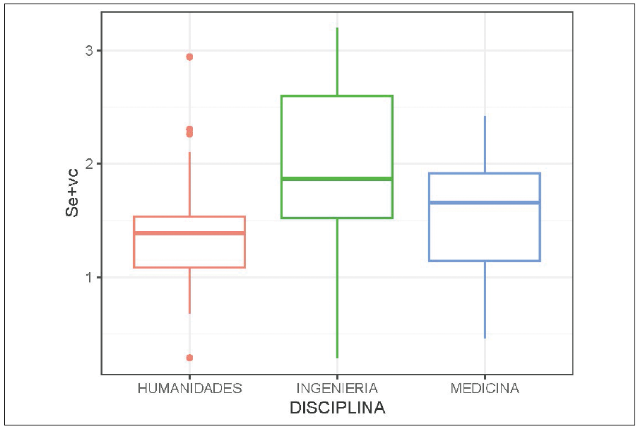 Con respecto a la comparación de la estructura sintáctica con se + verbo conjugado sí se encuentran diferencias significativas entre las áreas (p = 0.0004). El promedio de ocurrencias de este tipo de estructuras por cada 100 palabras para el corpus de ingeniería fue de 2 mientras que para medicina, biología y ciencias de la salud, y para humanidades resultó menor a 1.6 en ambos subgrupos. Mientras que el 50% de los textos de ingeniería alcanza una ocurrencia por cada 100 palabras de 1.8, en los corpus de medicina y humanidades esta cifra desciende a 1.7 y 1.4, respectivamente.