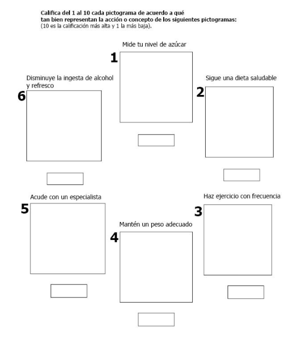 Diseñar los pictogramas para los referentes: Mide tu nivel de azúcar; sigue una dieta saludable; haz ejercicio con frecuencia; mantén un peso adecuado; acude con un especialista y disminuye la ingesta de alcohol y refrescos, siguiendo el método propuesto por la Fundación ONCE.