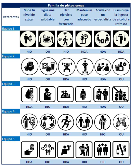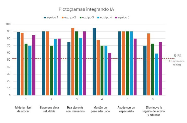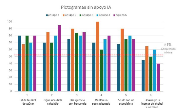Se observa que el equipo 2 fue el que obtuvo el mayor promedio de calificaciones asignadas en el test de Siebenhandl et al. (2007), logrando 83 en comparación con el equipo 1, que obtuvo 68. Los equipos 2 y 4 obtuvieron los seis pictogramas aceptados, mientras que los equipos 1, 3 y 5 lograron cinco pictogramas. El referente “haz ejercicio con frecuencia” fue el que obtuvo el mayor reconocimiento y comprensión; el subsiguiente fue el segundo referente: “sigue una dieta saludable”.