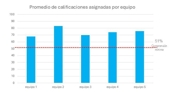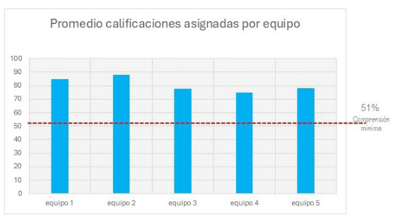 En comparación con el grupo A, se puede notar que en el grupo B las calificaciones otorgadas fueron mayores: el equipo 2 obtuvo 88, seguido del equipo 1 con 84. El equipo 4 obtuvo la menor calificación. Se puede notar que en el grupo A la mayoría de los equipos se mantuvieron apenas encima del 70.