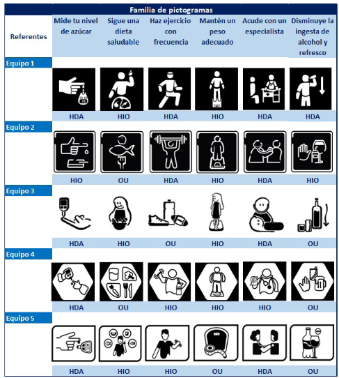 Se asignaron cinco grupos de estudiantes con seis miembros, a los cuales les fue asignada al azar una de las seis acciones de prevención de la diabetes mellitus tipo 2. En la tabla 2 se describe brevemente la forma en que fue aplicado el método para el diseño de pictogramas de la Fundación ONCE (2013).