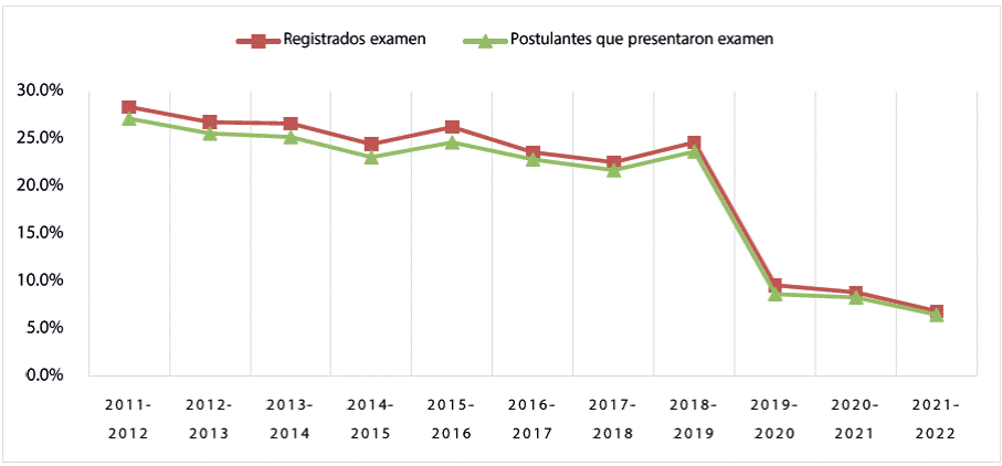 Fuente: elaboración propia con base en datos del EXANI-I 2012-2022 proporcionados por Ceneval y el Sistema de Estadísticas Continuas de Educación del Formato 911, DGPPyEE, SEP.