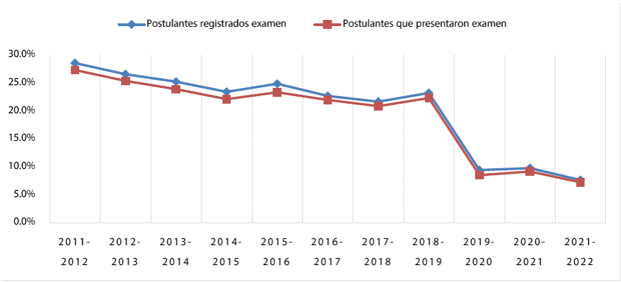 Se observa que la participación del EXANI-I como examen de ingreso ha disminuido de forma considerable en los últimos años, con tan solo 10% en relación con la población objetivo. Las Figuras 1 y 2 dan cuenta de que la proporción de sustentantes que presentaron el examen con respecto a los egresados de secundaria es ligeramente mayor que la proporción en relación con los nuevos ingresos en todos los ciclos, excepto en 2011-2012, 2020-2021 y 2021-2022. Estos efectos sugieren que en la mayoría de los ciclos escolares estudiados hubo más egresados del ciclo anterior que tomaron el examen, en comparación con la proporción de los que ingresaron finalmente a EMS por medio de EXANI-I. Ello podría dar cuenta de que algunos sustentantes no ingresan a EMS después de presentar el examen de ingreso o que tienen problemas de naturaleza diversa que impiden su ingreso después de haber presentado el EXANI-I.