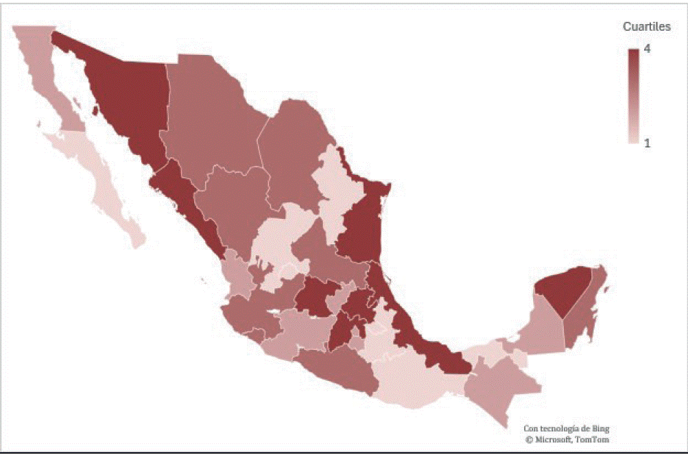 Figura 3 Estados clasificados por cuartiles según número de registrados promedio al EXANI-I