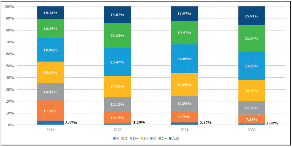 Para valorar el estatus socioeconómico de las familias del alumnado que se postula al EXANI-I, se examinan los cambios anuales en las categorías del Índice NSE de AMAI durante el periodo 20192022. La Figura 4 da cuenta de las fluctuaciones y tendencias por nivel socioeconómico entre las personas sustentantes. En AMAI el nivel E representa el estrato socioeconómico más bajo. Aunque su participación fue baja en todos los años (menos de 5%), se observa un ligero repunte en 2022 (4.99%) respecto a años anteriores. Le sigue el nivel D, cuya participación ha disminuido con el tiempo, de 17.1% en 2019 a 7.35% en 2022. El nivel D+, que representa un grupo con condiciones socioeconómicas ligeramente mejores que el nivel D, muestra una participación de 14.81% en 2019, pero un decremento relativamente constante en su participación, con 10.85% en 2022. El decremento de participación de los niveles D y D+ podría deberse a barreras de acceso creciente o a cambios en la captación de sustentantes por parte de las instituciones que utilizan EXANI-I.