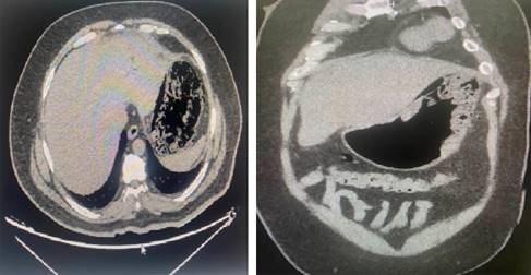 Ante cuadro clínico sugerente de abdomen agudo, se decidió realizar una tomografía computarizada de abdomen urgente, en la cual se describió la presencia de distensión gástrica, asociado a neumatosis difusa (Figura 1).