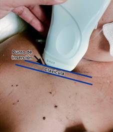 A nivel de la clavícula derecha o izquierda se procede a visualizar las estructuras anatómicas a una profundidad de 1 a 1.5 centímetros aproximadamente de la línea de la piel al vaso, colocando el transductor lineal de 7-13 mHz en sentido longitudinal, previa aplicación de gel de ultrasonido, a nivel del tercio medio interno de la clavícula (fosa supraclavicular) con el borde del transductor en contacto con el borde posterior del hueso de la clavícula y con la marca del transductor dirigido al hombro ipsilateral. Se observará la vena subclavia en eje longitudinal con paredes delgadas con presencia de valvas en su interior y con prueba de compresión positiva.