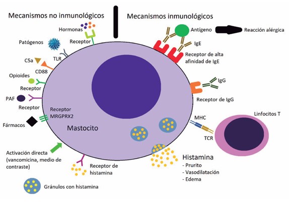Figura 1 Figura 1. Mecanismos de desgranulación del mastocito. Diversos estímulos pueden desencadenar la desgranulación del mastocito con subsecuente liberación de mediadores inflamatorios, principalmente histamina, que favorecen la vasodilatación, edema y prurito, responsables de la formación de habones. Dentro de los mecanismos inmunológicos se encuentra la unión de la IgE con un antígeno (reacción alérgica), a través de la IgG o directamente por otras células inmunitarias a través del complejo mayor de histocompatibilidad. En los mecanismos no inmunológicos, las hormonas, opioides, péptido activador de plaquetas e histamina pueden desgranular al mastocito mediante receptores específicos. Durante las infecciones existe activación directa a través de los receptores tipo Toll o por activación del complemento y la liberación de anafilotoxinas. Algunos fármacos pueden desgranular al mastocito directamente (vancomicina) o mediante el receptor MRGPRX2, aunque el paciente no sea alérgico. Los medios de contraste yodados también pueden desgranular a los mastocitos y basófilos de forma directa, con subsiguiente liberación de histamina. IgE: inmunoglobulina E; IgG: inmunoglobulina G; MHC: complejo mayor de histocompatibilidad; TCR: receptor de linfocitos T; TLR: receptor tipo Toll; PAF: péptido activador de plaquetas.