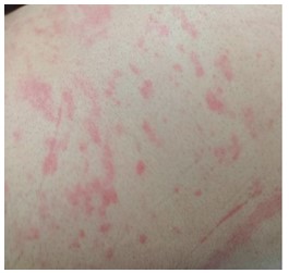 Puede acompañarse de síntomas sistémicos en 25% de los casos.4 Los más reportados incluyen: sibilancias, disnea, tos, rinorrea, mareo, malestar gastrointestinal (náusea, vómito, diarrea o dolor abdominal), cefalea, taquicardia, dolor articular o conjuntivitis.1 En estos pacientes debe sospecharse de anafilaxia y tratamiento consiste en adrenalina. Cuando hay fiebre deberá descartarse algún proceso infeccioso.55