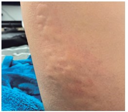 La urticaria es una enfermedad que afecta la piel y las mucosas, y se caracteriza por la aparición transitoria de habones, angioedema, o ambos.1 Por su parte, la urticaria aguda y la crónica tienen una duración menor y mayor de 6 semanas, respectivamente.2 La urticaria aguda es idiopática en la mayoría de los casos y la etiología alérgica representa el 2.4% de los casos.3 Dentro de los factores desencadenantes más frecuentemente identificados se reportan infecciones, fármacos, alimentos y picadura de insectos.4,5