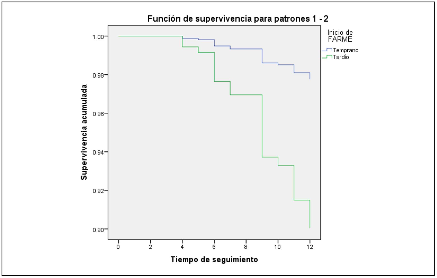Esta figura (Figura 2), representa la curva de supervivencia ajustada por las covariables y vemos cómo va incrementando el evento de falla en quienes se inició de forma tardía el FARME.