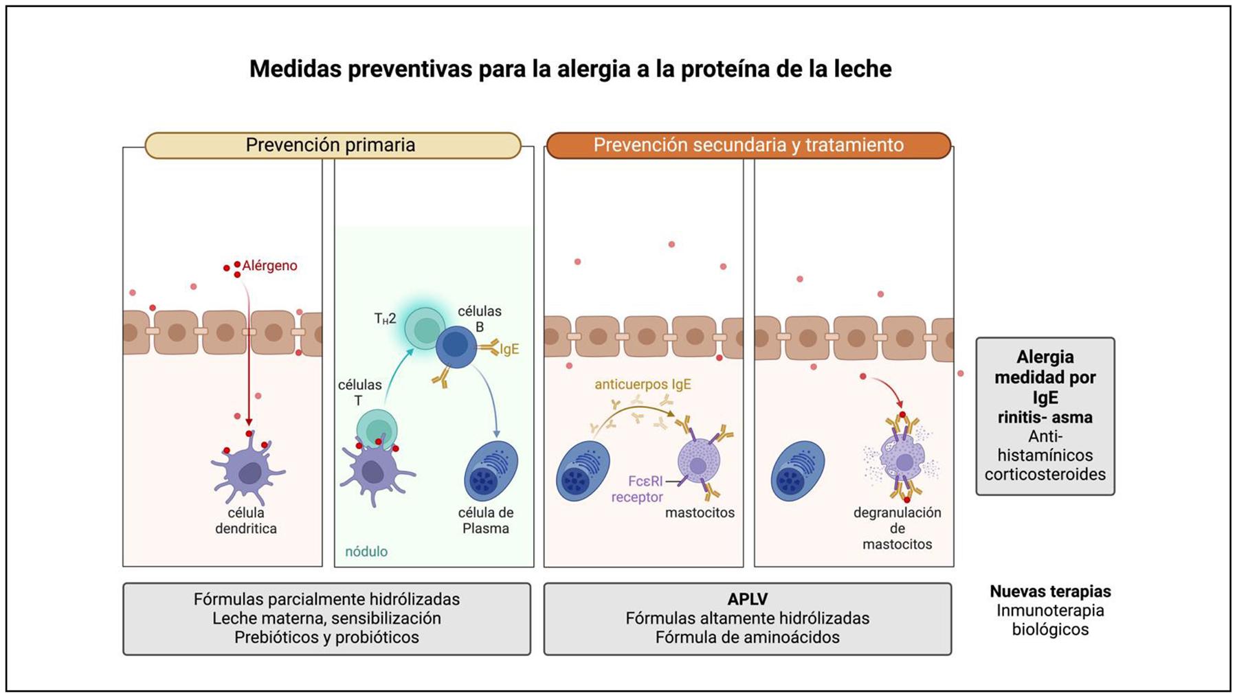 Figura 1. Medidas preventivas para la alergia a la proteína de leche. Adaptado de1,2 Figura creada con BioRender.com.