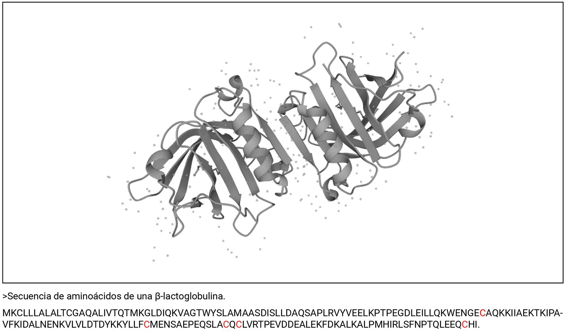 La leche de bovinos está compuesta por aproximadamente 40 proteínas distintas de las cuales la mitad son potencialmente alergénicas. La caseína representa aproximadamente un 80% de estas proteínas, y el resto está compuesto mayoritariamente por α-lactoalbúmina, β-lactoglobulina y existen otras proteínas pero en mucho menor proporción (Cuadro 1 y 2). Las tres proteínas de mayor relevancia en la alergia mediada por proteína de la leche de vaca son la caseína que es termoestable, eso es que 120 °C por 15 min no altera la antigenicidad; la β-lactoglobulina (BLG) y la α-lacto albumina.7,9,10,18 En particular la BLG está ausente en la leche materna y puede generar reacciones alérgicas aún después de la pasteurización.19 La β-lactoglobulina es una proteína extracelular pequeña que contiene 178aa y un peso de 19,883Da (Figura 2). El identificador como alérgenos en la base de datos del alergoma es 164 y 2739 (164, Bos d 5, 2739, Bos d 5.0101).