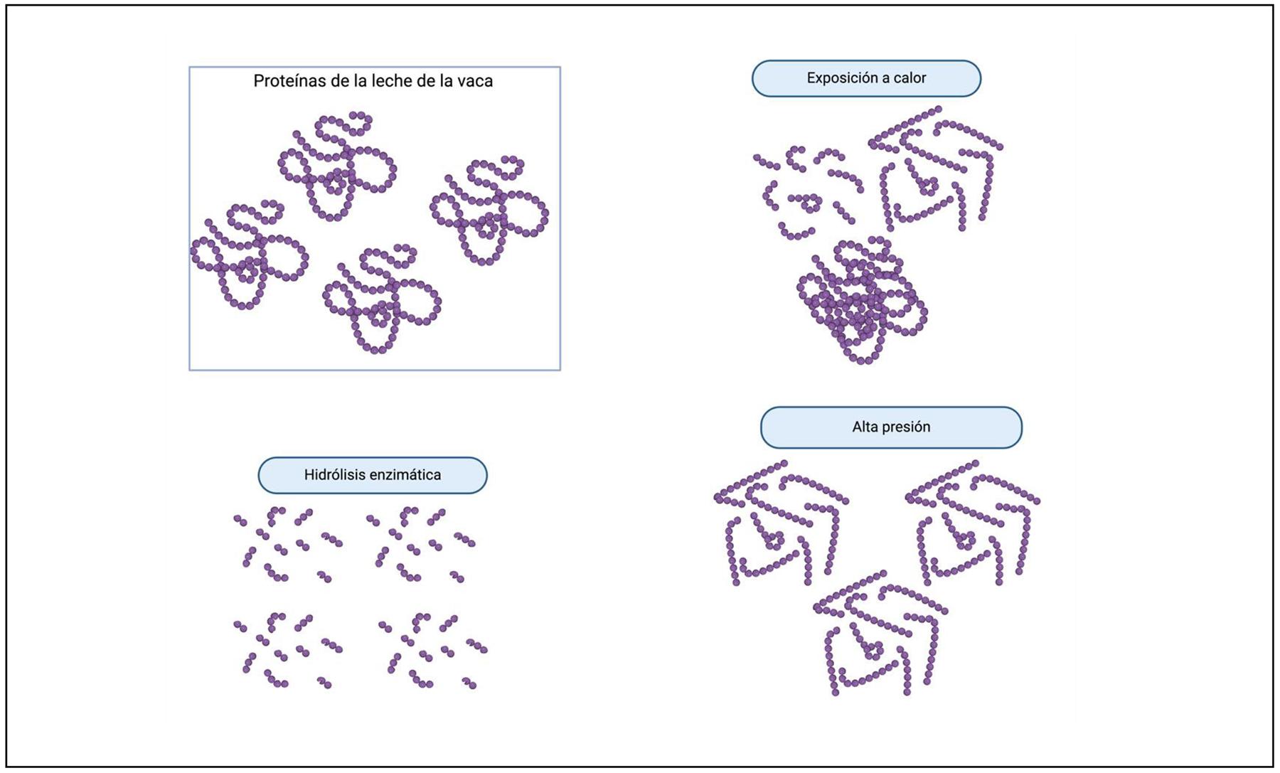 Figura 3. Representación de los cambios en la estructura de proteínas inducidas por tratamientos o procesamiento. Nótese que la hidrólisis enzimática provoca una mayor degradación o proteólisis de las proteínas, destruyendo las estructuras primarias, secundarias, terciarias y cuaternarias, al generar péptidos más pequeños; mientras que los tratamientos térmicos y de presión puede causar la desnaturalización o agregación de proteínas, pero no necesariamente su hidrólisis. Figura creada con BioRender.com.