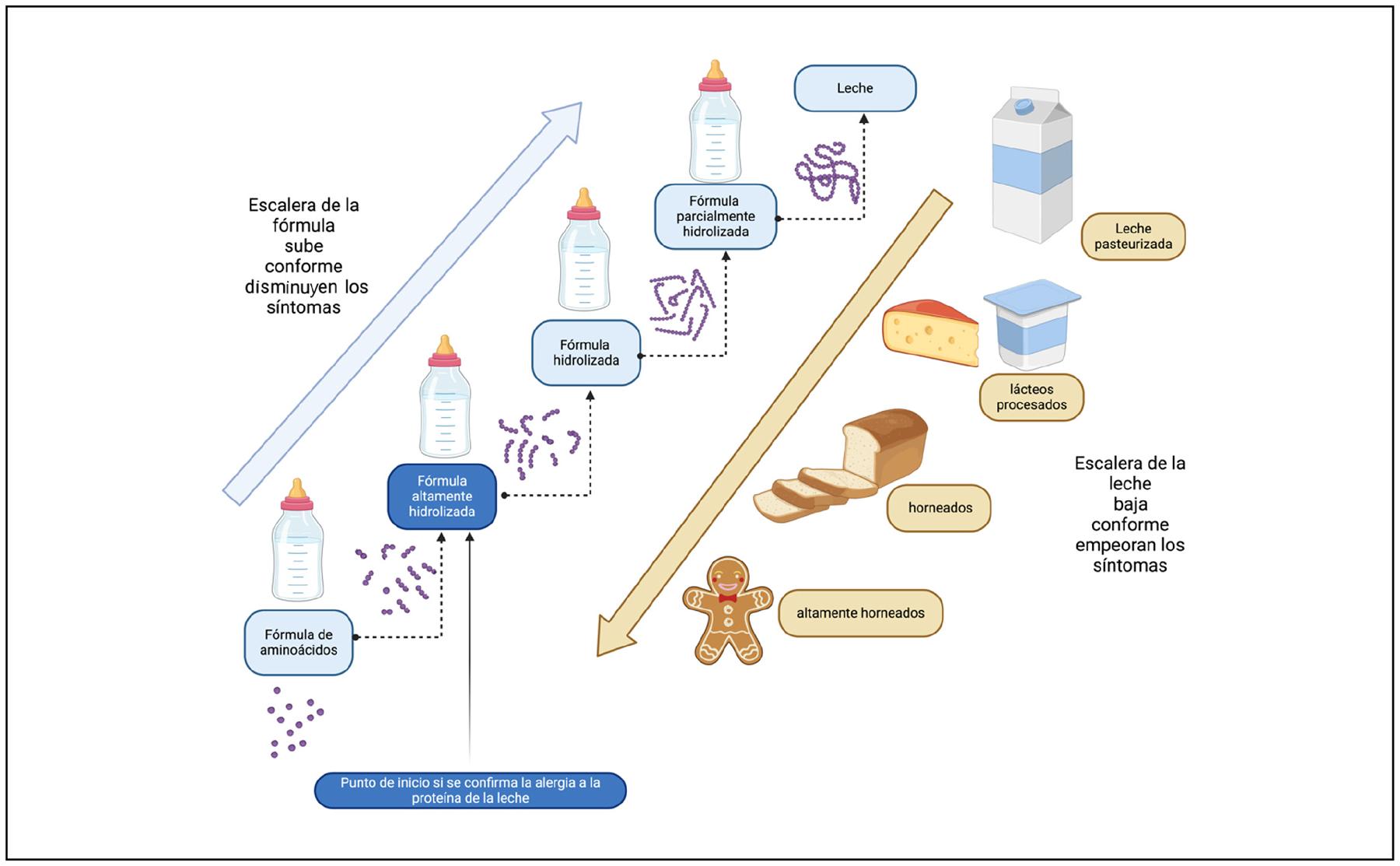 Existen además terapias emergentes con ensayos con clínicos mediados por anticuerpos monoclonales contra los anticuerpos IgE, que complementan la ITO como el duplimab y el omalizumab, y que al parecer muestran mejorías versus el placebo en alergias alimentarias (Ensayo clínico NCT04148352, Ensayo clínico NCT01157117).62–64 Además, una de las estrategias de reintroducción de los alimentos es usar la escalera del uso de las fórmulas hidrolizadas y la escalera de la leche conforme mejoran o empeoran los síntomas (Figura 4).1