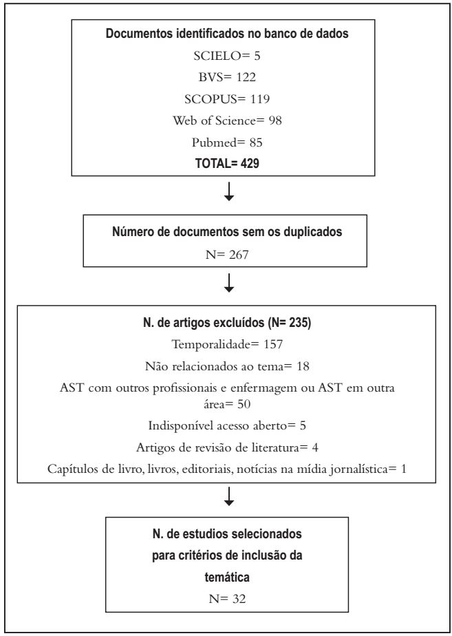 Salientamos que a seleção dos artigos, de acordo com os critérios de inclusão e exclusão, foi realizada por duas pesquisadoras, como recomendado por Pereira e Galvão (2014). Em alguns casos, após a leitura do título e resumo, foram excluídos artigos que não compreendiam os critérios de inclusão. Em outros, foi preciso ler na íntegra o texto para a decisão de incluí-lo ou não. A seguir, a Figura 1 aponta o caminho para a amostra final de 32 artigos sobre o tema do AST no trabalho de enfermagem.