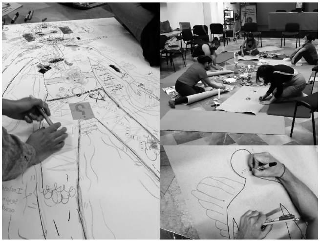 A fin de lograr lo anterior, se puso en práctica un segundo ejercicio gráfico de mapeo que nos permitió representar, a partir de la idea de cuerpa, una corporalidad diferente, capaz de reconocerse a sí misma como colectiva. Mientras cada participante presentaba su mapa corporal, dos compañeras de la colectiva Caracola Tejedora fueron representando, en una silueta en blanco, el conjunto de los daños y las reflexiones que iban emergiendo desde el círculo de la palabra.