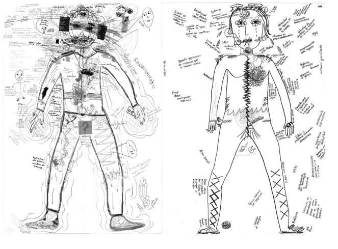 Las marcas asociadas a tales daños son particularmente evidentes en los cuerpos colectivos masculinos. En los dos mapas-relatos elaborados por los compañeros se puede percibir con claridad la presencia insistente de una multiplicidad de malestares y emociones negativas asociadas a estos daños, tales como sentimientos de inseguridad profunda y paralizante, baja autoestima, nerviosismo, estrés, ansiedad, o, peor aún, la sensación de estar atrapados en la repetición de comportamientos soberbios y agresivos que no se logran limitar.