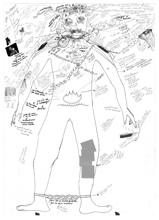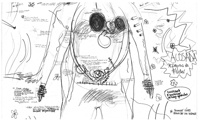 De ellas hemos aprendido que el contramapeo del cuerpo puede transformarse en una herramienta sumamente fértil para generar(nos) un lugar de enunciación propio: una contranarrativa situada y encarnada, construida desde el tejido vivencial de lo corporal (Marchese 2020: 294). Al igual que otras metodologías de investigación que exploran el potencial epistemológico inscrito en las experiencias corporales (por ejemplo, Esteban 2004), los ejercicios de mapeo corporal permiten verbalizar y “conceptualizar sentires” (Ruiz Trejo y García Dauder 2018: 58) tomando como punto de partida las experiencias vividas y la reflexión colectiva encarnada. En tal sentido, son herramientas metodológicas que ayudan a explotar el valor epistémico del cuerpo y a romper formas de silenciamiento impuestas o naturalizadas como efecto de las relaciones de dominación que nos atraviesan. Recurriendo nuevamente a las palabras de Dorothy Smith, podríamos decir que el contramapeo corporal nos permite generar espacios donde logramos practicar colectivamente “la personificación en el terreno despersonalizado de las relaciones de dominación” (2012: 13), espacios que dan cabida a la experiencia para desde allí construir una voz capaz de visibilizar las relaciones que nos oprimen.