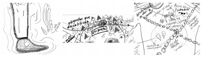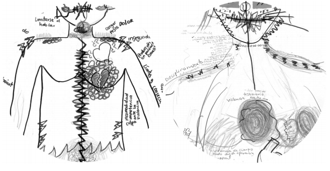 Los daños asociados con estos tipos de prácticas son representados de diferentes formas en los cuerpos. Algunas de las más notorias son dibujarse con etiquetas de descalificación en la frente o con oraciones despectivas en el pecho; representarse con la cabeza chica o con las alas cortadas por sentirse continuamente disminuidxs por lo que se piensa, dice y escribe; dibujarse con los hombros encogidos, con una cadena o con sensación de opresión en el pecho, con las manos y la frente sudorosas o con lágrimas en los ojos para indicar malestares asociados con una sensación de baja autoestima e inseguridad constante; o retratarse con dolores y malestares en la boca para indicar una gran cantidad de violencias ejercidas y recibidas a través de expresiones verbales violentas.