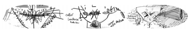 3. Otro aspecto muy llamativo de los mapas-relatos de personas criadas como mujeres es la reiteración de las bocas anuladas, censuradas o cosidas, así como de las representaciones de dolores en la garganta y las mandíbulas asociados con los silencios guardados, con la imposibilidad de expresarse y sostener una voz propia. La anulación continua de la voz femenina parece ser un problema estructural en nuestro espacio académico. Dicha anulación se da de distintas formas. Algunas de las más notorias y denunciadas han sido el predominio en las aulas y en los debates de voces masculinas que acaparan de forma desconsiderada el tiempo, el espacio y los temas de discusión e inhiben las participaciones de las mujeres; la actitud recurrente de muchos varones -profesores y estudiantes por igual- de editar, corregir, invalidar o estigmatizar lo que las mujeres dicen, hacen o investigan; o la dificultad para plantear temas y métodos de investigación de interés de las mujeres. Cuentan nuestras cuerpas dañadas: