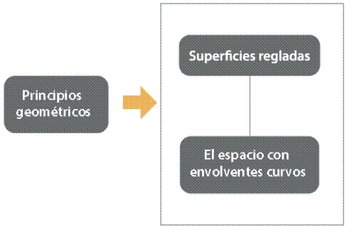 Figura 1 Principios geométricos de las superficies regladas que al cubrir el espacio se convierten en un envolvente curvo. Elaboración: Moisés Barrera Sánchez, Julia Judith Mundo Hernández y María Cristina Valerdi Nochebuena.