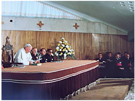Figura 12 Reunión CELAM 1979, celebrada en la Capilla de Diario del Seminario. Fue presidida por el Papa Juan Pablo II; a su izquierda se encuentra el arzobispo D. Rosendo Huesca. Fuente: http://whispersintheloggia.blogspot.com/2006/11/speaking-of-episcopal-plenaries.html