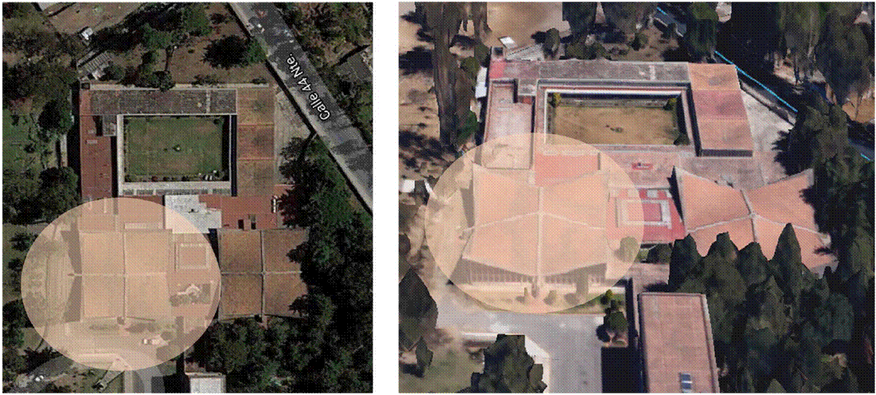 Figura 13 Vista aérea y tridimensional de la zona de comedores de alumnos, comedor de superiores y casa de religiosas, espacios originalmente para ese uso en el proyecto; se resalta el área que actualmente ocupa la capilla. Fuente: Google Earth, 13 de febrero de 2020.