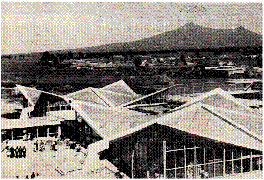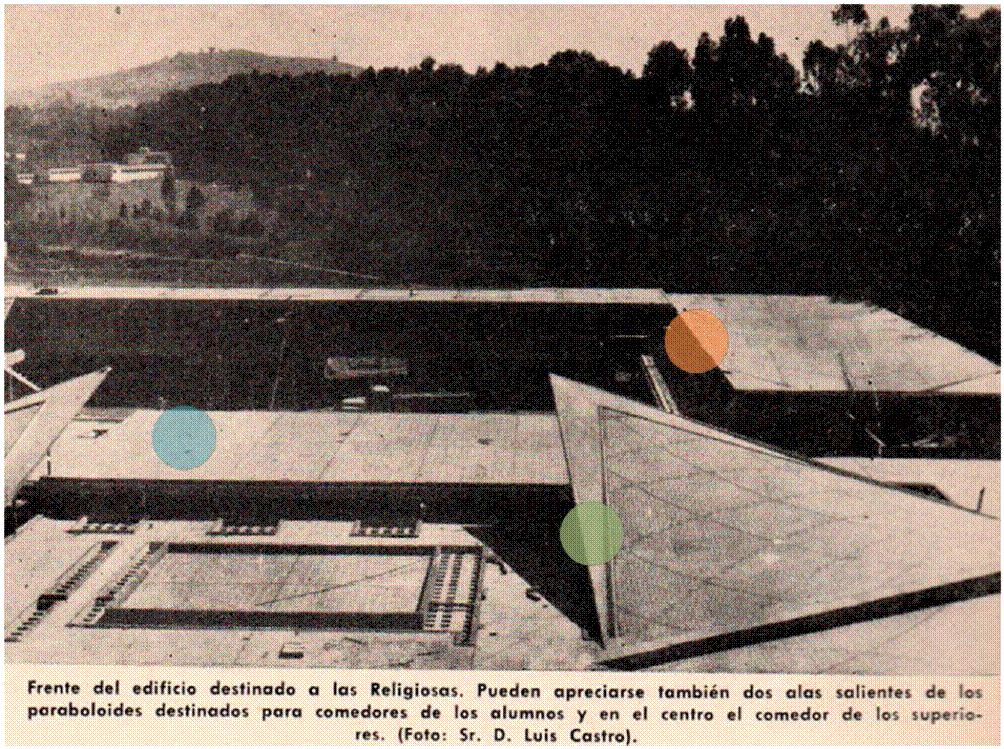 Figura 15a Aspecto exterior de la cubierta paraboloide hiperbólica; se observan los mantos que la conformaban en 1961 los nervios y los cuatro brazos de concreto que los soportan. Fotografía: Luis Castro, Palafoxianum, junio 1961.