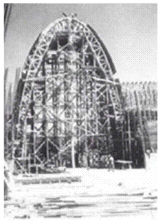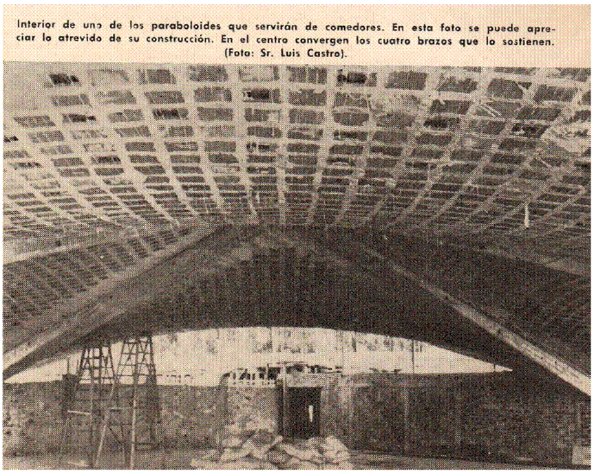 Figura 16a Vista interior de la construcción de los mantos de forma paraboloide hiperbólica y de los nervios que los soportan. Fotografías: Luis Castro, Palafoxianum, junio 1961.