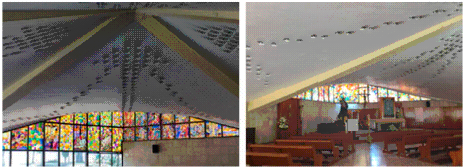Figura 18 a-b. Interior de la capilla donde se observan los ventanales y los vitrales de temas acerca de la pasión de Cristo.