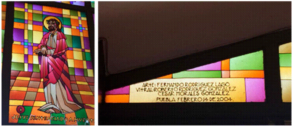 Años más tarde, cuando uno de los comedores cambió su uso a capilla doméstica, se sustituyeron los cristales de la parte superior por vitrales de colores con figuras geométricas y temas alusivos a la pasión de Cristo, obra de arte del pintor, escultor y muralista poblano Fernando Rodríguez Lago,19 realizados por Roberto Rodríguez González y César Morales González del año 1993 al año 1997; fueron terminados totalmente e inaugurados en 2004, fecha inscrita en uno de los vitrales.