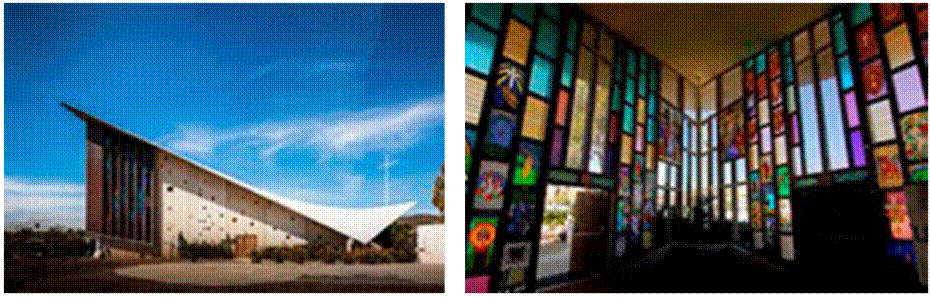 Figura 5a-b Exterior e interior (en el que se observa el uso de vitrales) de la Carlton Hills Lutheran Church (1959), situada en Santee, California. Fotografía exterior: Darren Bradley, 14 de marzo de 2018. http://www.modernsandiego.com/RobertDesLauriers.html. Fotografía de vitrales: Flickr https://midcenturymodernist.tumblr.com [consulta: 14 de marzo de 2019].