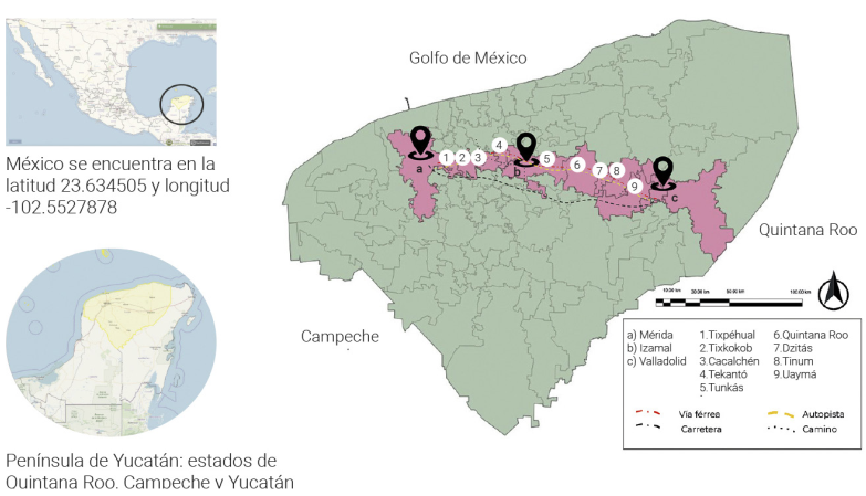 Para el desarrollo de esta investigación se realizó una exhaustiva revisión histórica que incluyó el análisis de documentos, testimonios y registros clave sobre la evolución del paisaje yucateco. Se consultaron fuentes como la Enciclopedia yucatanense16y elAtlas de procesos territoriales de Yucatán,17 que ofrecen una visión general y especializada sobre los procesos históricos de la región. También se revisaron las Relaciones histórico-geográficas de la gobernación de Yucatán18 y crónicas coloniales de figuras como Diego de Landa y Diego López de Cogolludo. Además, se incorporaron estudios específicos, como los de Othón Baños sobre la reconfiguración rural-urbana en la zona henequenera de Yucatán,19 y el análisis de Gaia Carosi sobre el estudio de caminos históricos en la Península de Yucatán.20 La investigación también incluyó los trabajos de Sergio Quezada,21 así como estudios cartográficos de Arturo Taracena Arriola y Miguel Pinkus Rendón.22 El enfoque central fue comprender las interrelaciones entre los eventos históricos que han configurado el paisaje actual, utilizando una metodología que combina fuentes documentales y cartográficas para reconstruir cómo los procesos y transformaciones han influido a lo largo del tiempo.
