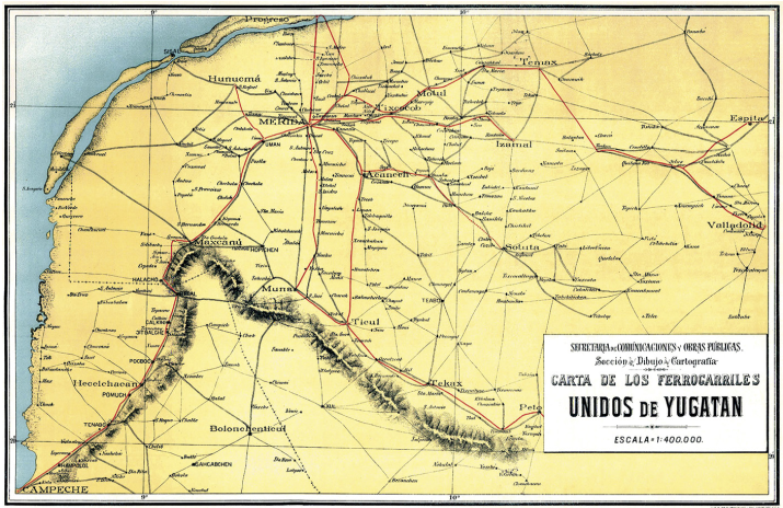 Figura 3 Carta de los Ferrocarriles Unidos de Yucatán. En esta carta se muestran las diferentes vías del ferrocarril existentes hacia principios del siglo XX, en donde se logran distinguir las vías que iban de Mérida a Izamal, y otra vía distinta Mérida-Valladolid que pasaba por los poblados de Motul y Temax, como centros importantes de recolección y almacenamiento de productos. Autor: Sección de Dibujo y Cartografía, escala: 1: 400,000, editor: Secretaría de Comunicaciones y Obras Públicas, medidas: 49 x 72 cm.