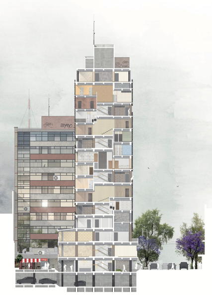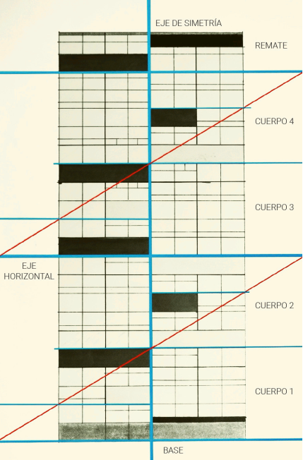 Cabe resaltar que la torre de departamentos posee una especial particularidad: sus interiores están resueltos con el sistema “3 a 2”, dado que cada tres niveles hay dos departamentos. Esta compleja distribución espacial se encuentra perfectamente explicada por Alejandro Pérez-Duarte, que con modelos tridimensionales nos ayuda a entender su totalidad.44 Al mismo tiempo, pone en la mesa la discusión económica del edificio como el producto ideal para la sociedad de consumo:45 mientras más varían las tipologías de departamentos, más plural se vuelve el edificio, es decir, se puede ofrecer a un público más amplio y atender las necesidades de diferentes personas, abarcando así un mercado más amplio.
