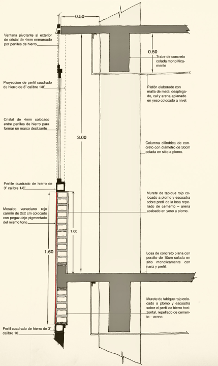 Como podemos ver en los cortes, toda la estructura se realizó en concreto armado. En la torre de departamentos los entrepisos son losas dispuestas en tableros irregulares de trabes con peraltes distintos cada una, no hay modulación. Las cargas bajan verticalmente en columnas cilíndricas coladas in situ y la cimentación funciona de manera parecida a lo que hoy conocemos como un cajón de cimentación, donde se encuentra el estacionamiento que descansa sobre pilotes igualmente irregulares.