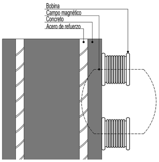 Antes de realizar cualquier lectura con el esclerómetro o la velocidad de pulso ultrasónico, es indispensable detectar la disposición del acero de refuerzo dentro del elemento, ya que los valores de los ensayos son afectados por su presencia. Por lo tanto, para obtener datos más certeros, así como evitar la extracción de núcleos con contenido de secciones de acero en su interior, se establecerán mapeos in situ y se ubicarán las áreas libres de este material. Adicionalmente, dependiendo del modelo y fabricante, el pachómetro puede proporcionar información complementaria como el espesor de la cobertura del concreto y diámetro del acero de refuerzo. El funcionamiento del equipo es a partir de la inducción de impulsos electromagnéticos basados en el principio de reluctancia magnética (Figura 1), donde el detector está constituido por una bobina en la que circula una corriente alterna que genera un campo magnético produciendo corrientes de remolino al detectar un material conductor dentro del campo.12